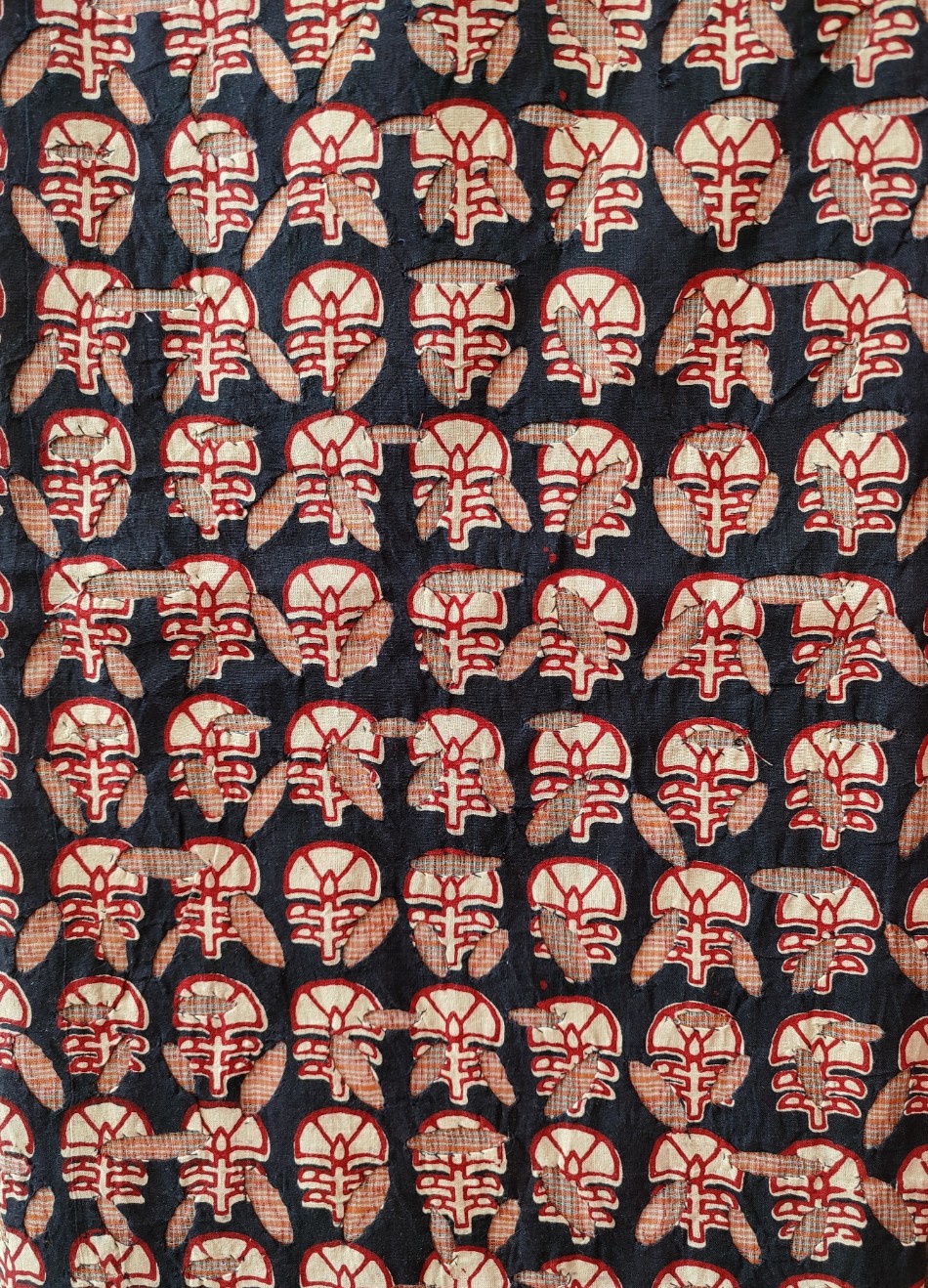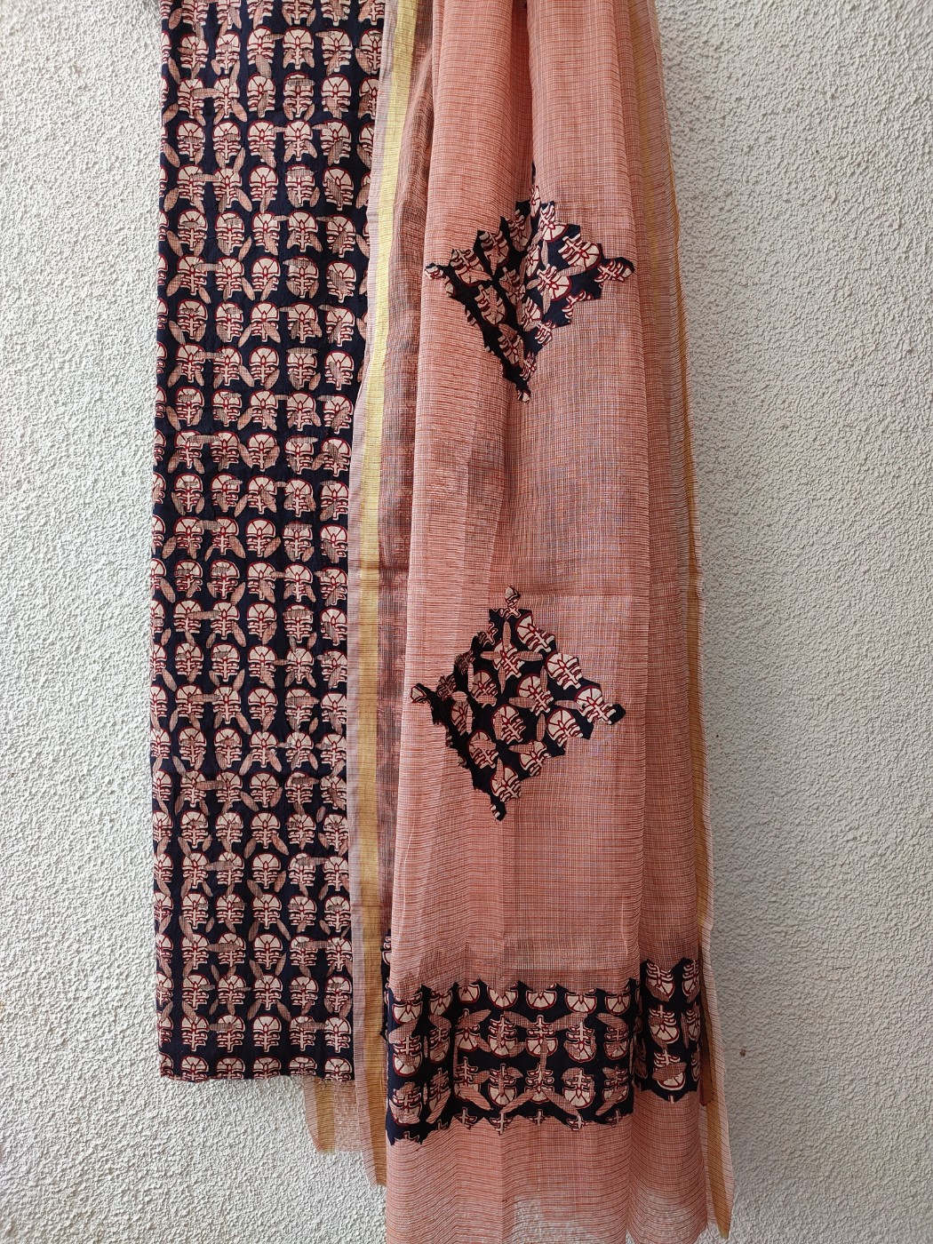 A beautiful set of kurti fabric and dupatta, with totally handcrafted, delicate applique work !! The kurti fabric has applique work done entirely on the front side in Ajrakh with kota doria as the base fabric; and the dupatta is in kota doria with ajrakh applique again !