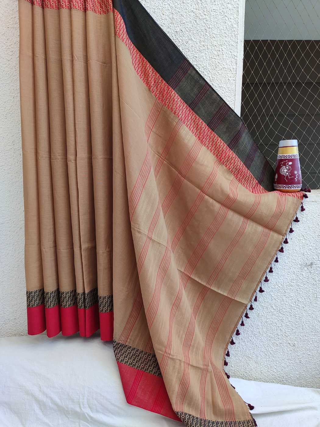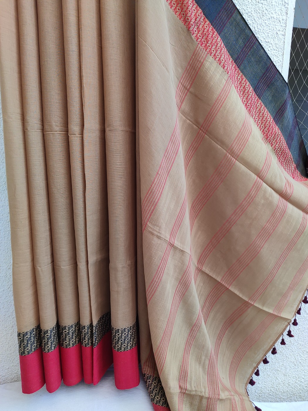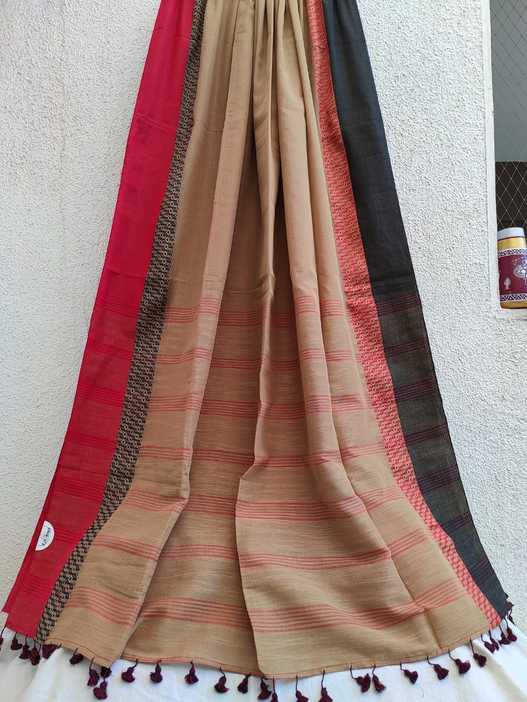 130 count super light and super soft pure handloom sarees in organic cotton. The pretty tassels enhances it’s beauty! The black and red borders on either sides makes it very graceful !